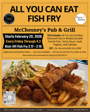 All You Can Eat Fish Fry in McChesney’s Pub & Grill on Tuesday, February 17, 2026, through Thursday, February 19, 2026. Reservations Recommended by Call 630.208.7600 x3.